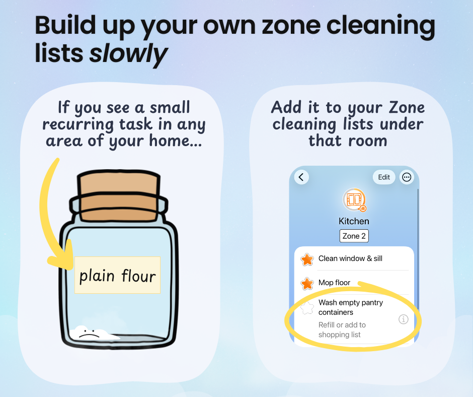 We have put some basic tasks into the zone room lists, but you know what’s in your place. Some cleaning apps have you identifying all your tasks and frequency schedule, as soon as you start using the app. That sounds stressful! I have a different idea.